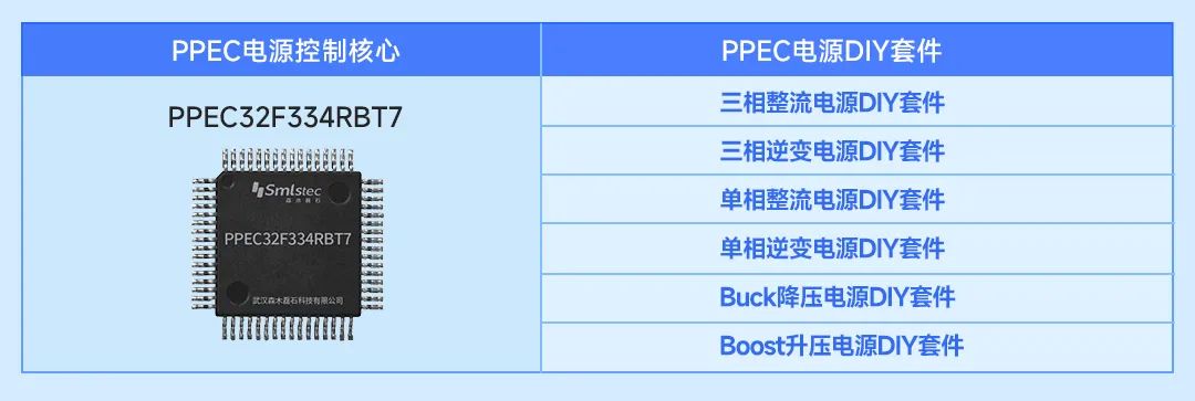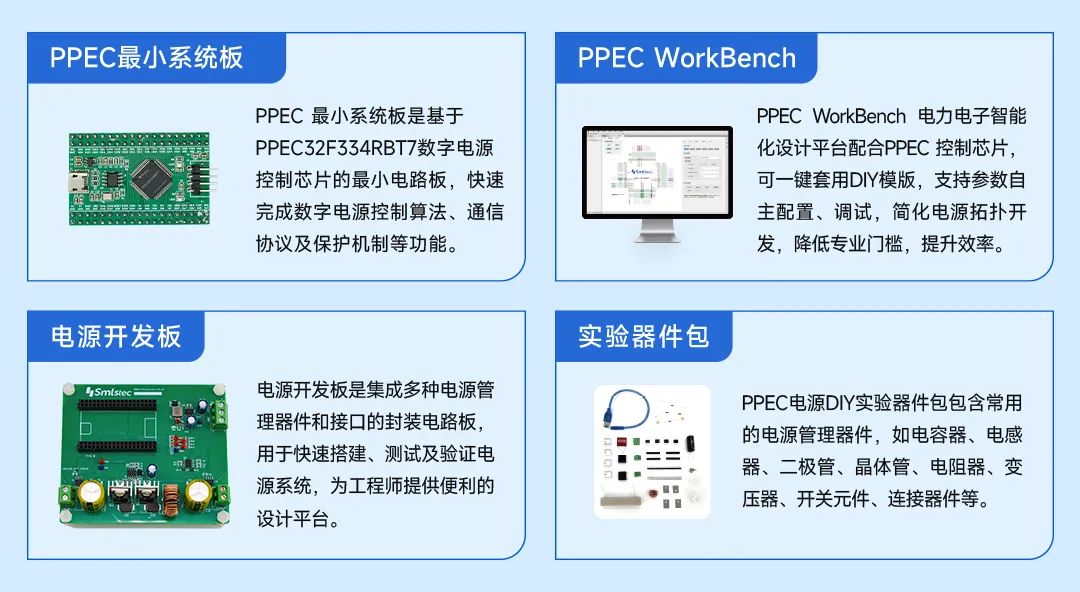 升级版开关电源 DIY 套件核心组件含:PPEC 最小系统板(PPEC32F334RBT7 芯片)、PPEC Workbnch 电力电子智能化设计平台、电源开发板以及实验器件包。